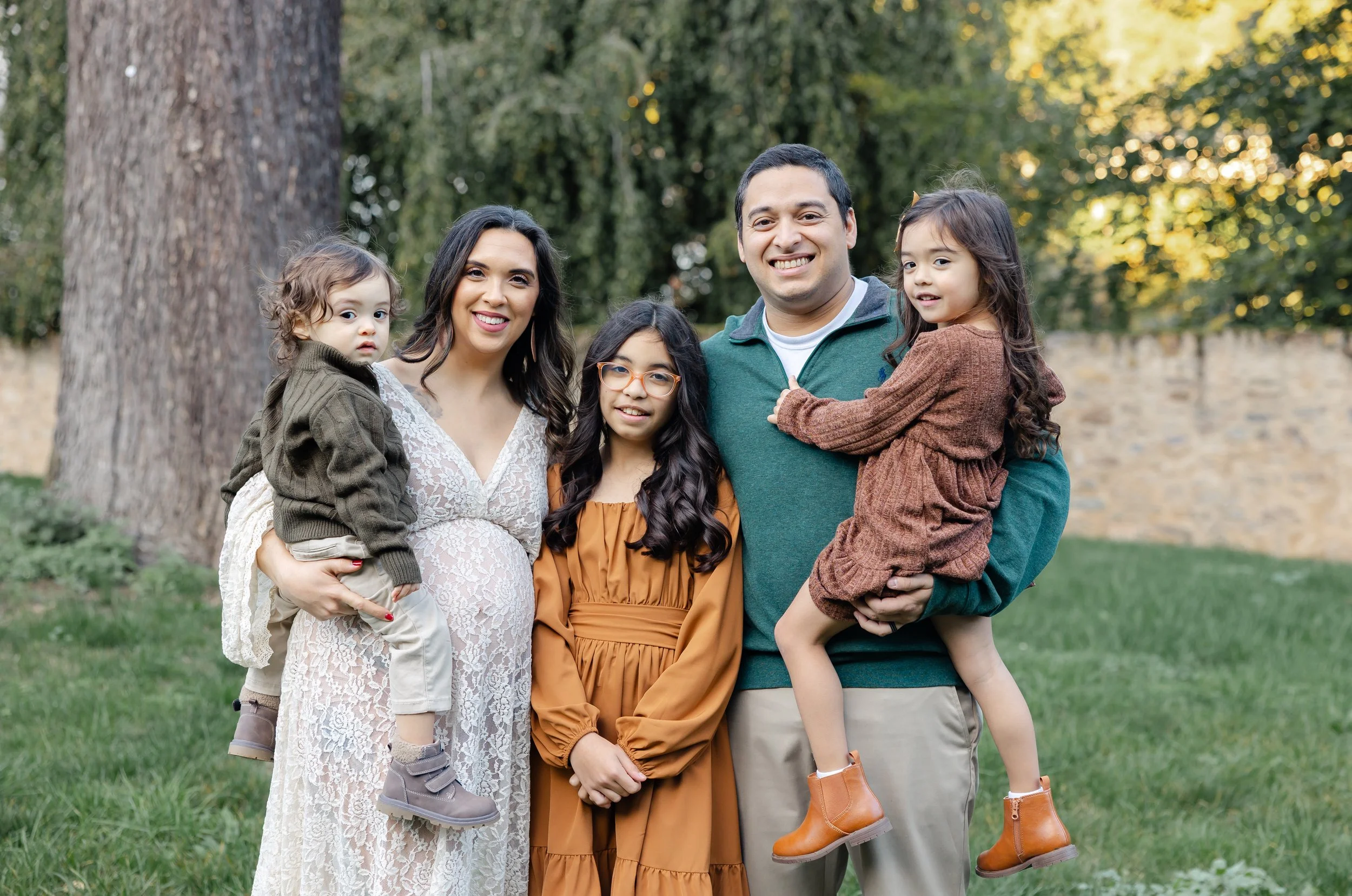 The session unfolded under the shade of grand old trees, where soft sunlight filtered through the leaves, casting a warm, golden glow over the family. Dressed in earthy tones and soft fabrics, the family’s wardrobe harmonized perfectly with the natural setting. From the children’s sweet expressions to the expecting mother’s graceful presence in a flowing lace gown, every detail spoke of joy, anticipation, and unity.