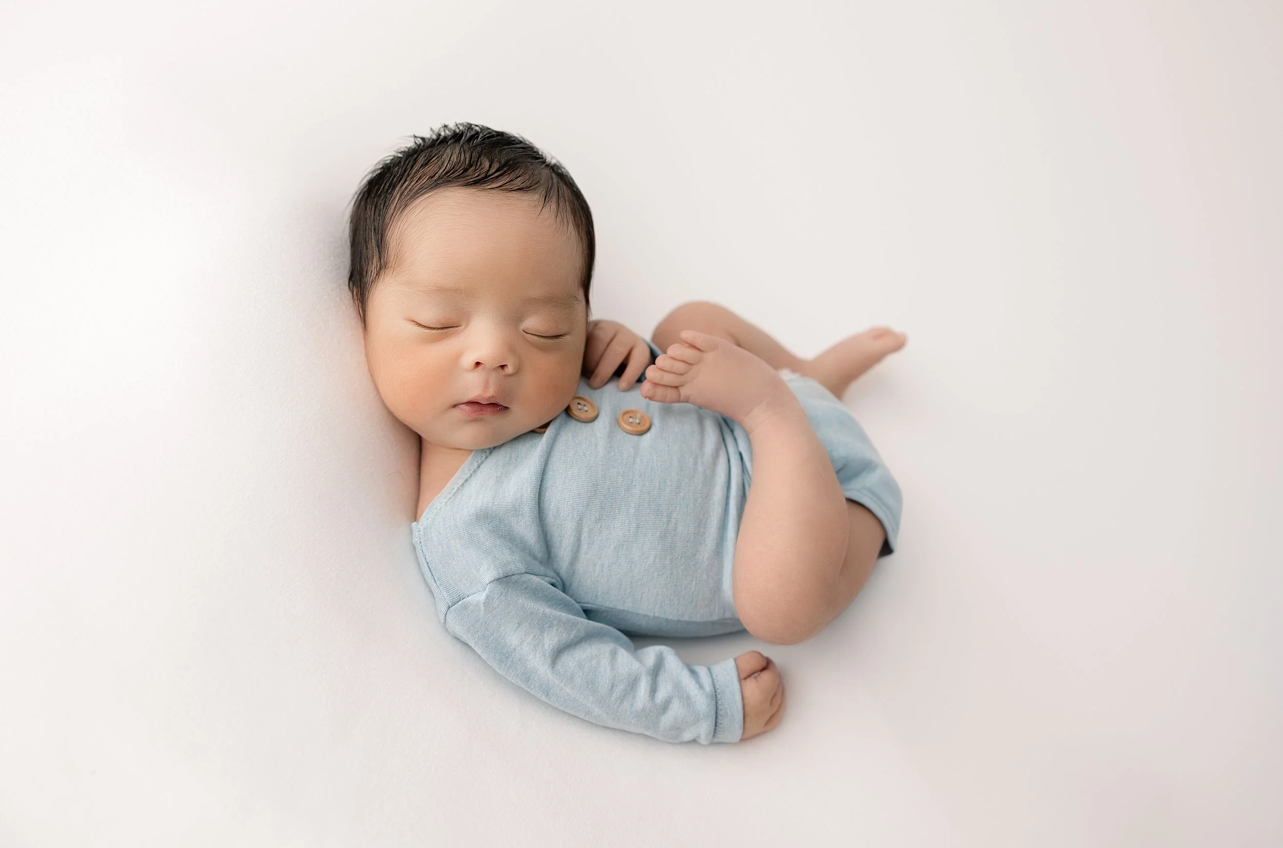 Our studio is fully equipped with professional lighting, handcrafted props, and a curated selection of wraps, bonnets, and outfits for baby boys and girls. During baby Theo’s session, we used neutral tones and gentle blues to keep the focus on his delicate features and tiny fingers and toes. The result? Elegant and emotive newborn portraits that his family will cherish for generations.