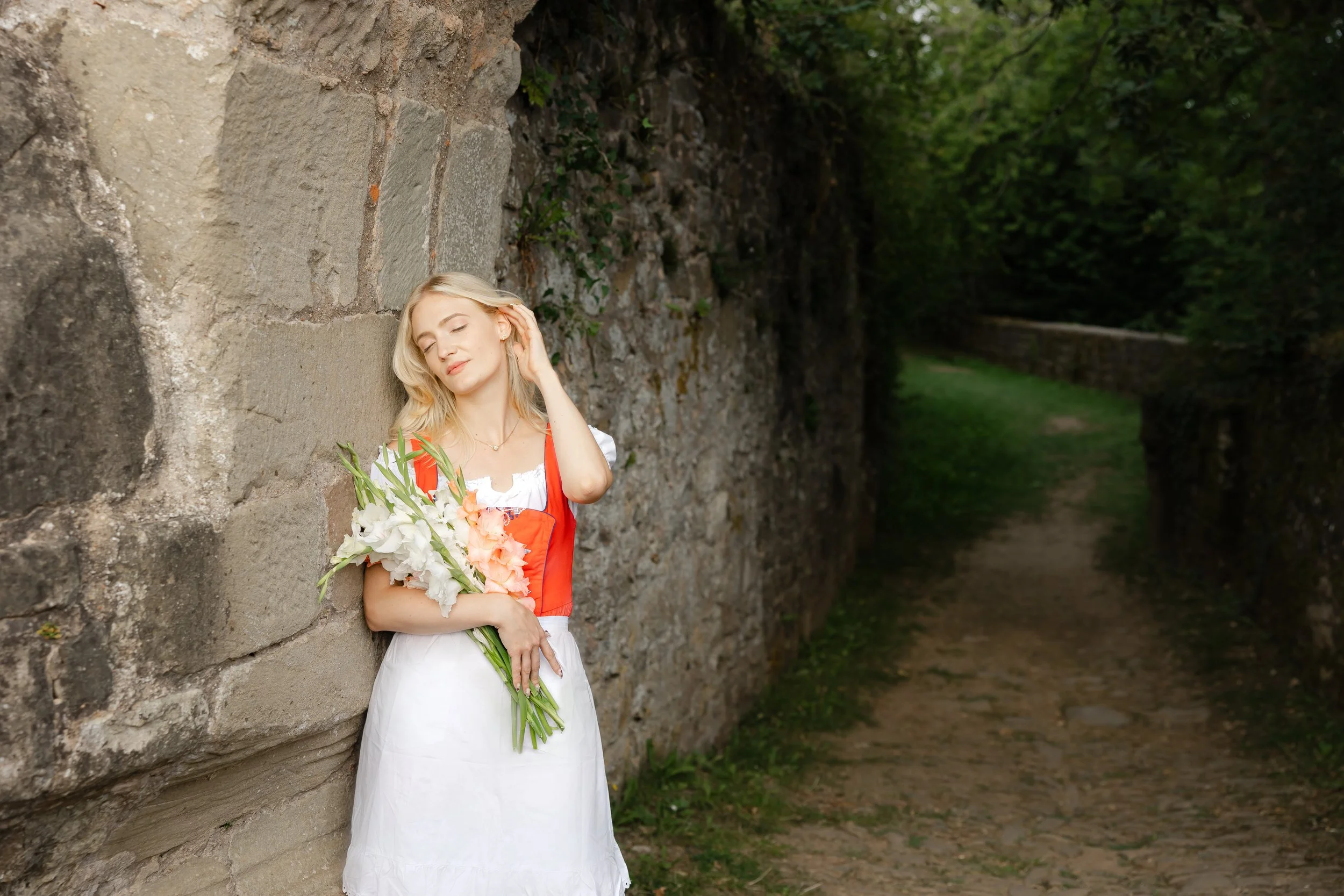 Burg Lichtenberg, one of the largest castle ruins in Germany, offered everything we could dream of for this shoot—arched stone windows framing panoramic views, ivy-covered towers, and winding cobblestone paths that seemed to beckon us into another time. The muted tones of the stonework created a perfect contrast to the vibrant textiles and delicate details of the dirndls.